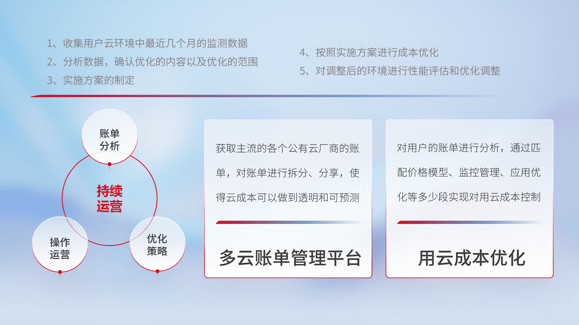 通过多云纳管,,,,以统一的资源数据模型把客户的云资源进行抽象和封装,,,,进而实现对多云资源的统一操作,,保障云资源管理的可靠性、、、、稳定性与可用性。。。量身定制化运维内容,,配置、、、开发运维、、补丁管理、、、备份、、、监控、、认证和访问管理、、审计和日常巡检等,,保障在用云过程中的可靠度,,稳定度以及高可用率。。。。